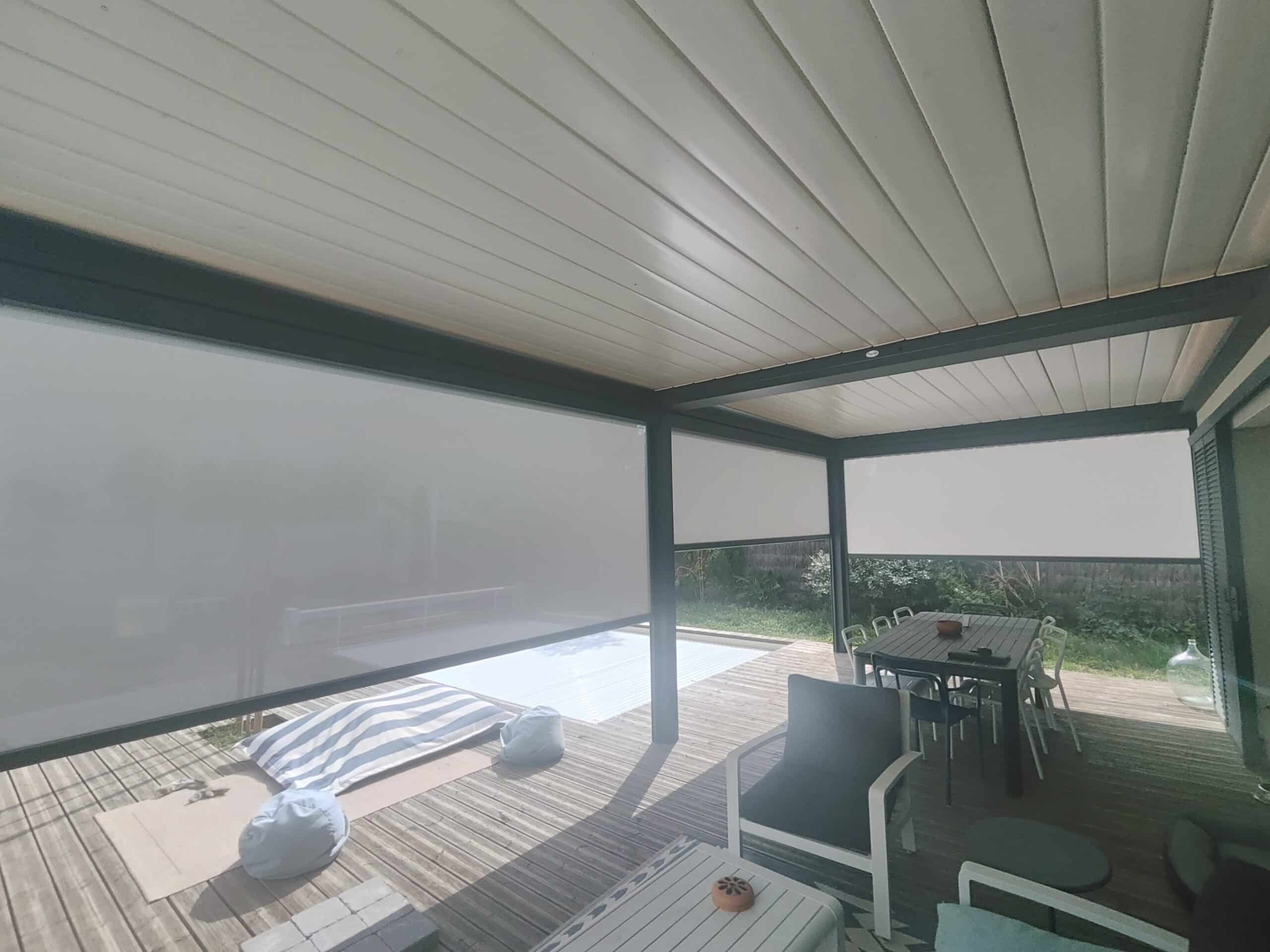 L’option qui répondait idéalement aux besoins et aux exigences de nos clients demeurait dans la pergola Erable complétée de 2 stores verticaux.